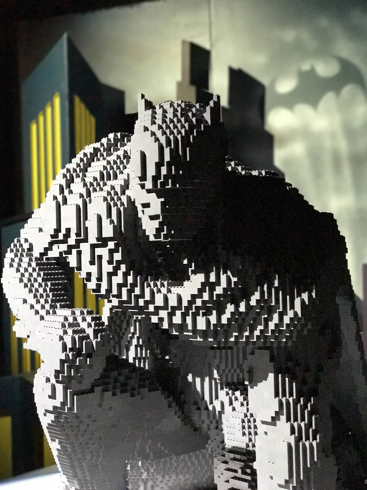 We’re almost at the end of the tour with the first of two Batman themed rooms. The first features a life size Batman and Bat signal as well as some colours cowls. The standout piece in this room is a life size Batman built out of blocks which recreate his first ever comic cover. Make sure to take some time to take in the Bat logo on the wall. At face value it’s a simple Bat shaped logo but when you look up close it is made up of hundreds of LEGO Batarangs. Absolute genius.