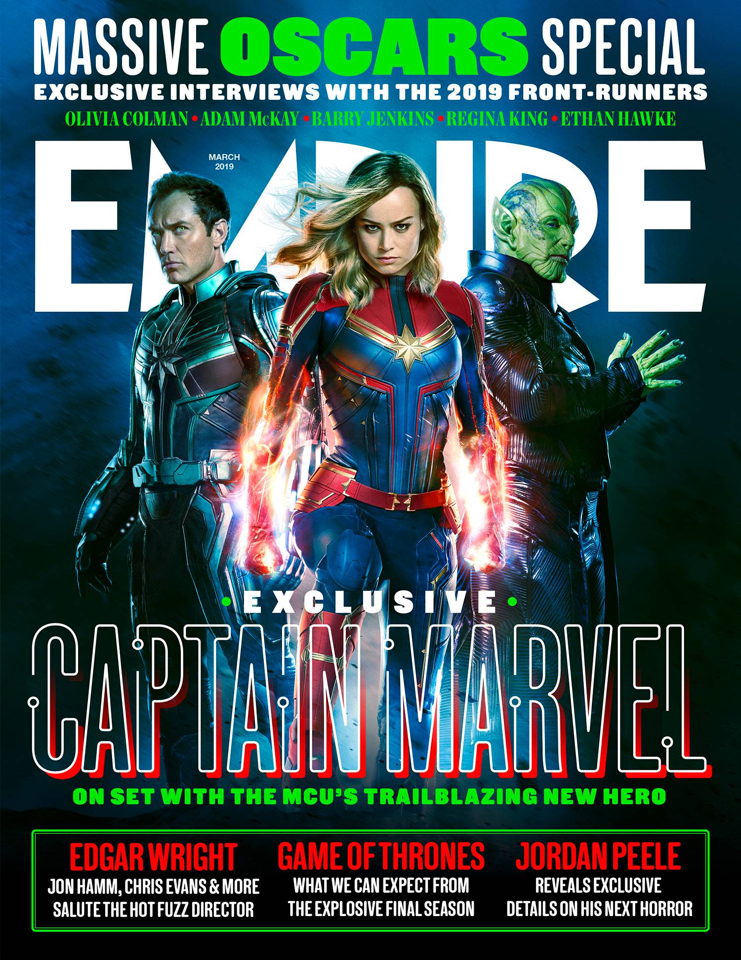 Captain Marvel is leading the cover of Empire Magazine’s March issue. The cover features Brie Larson, Jude Law and Ben Mendselsohn in full costume. It’s a spectacular new look at Carol Danvers, Mar-Vell (Yonn-Rog?) and Talos.