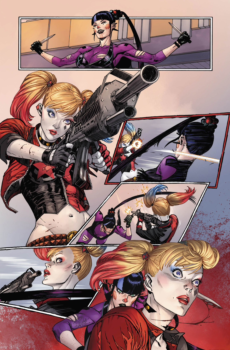 Batman #93, featuring the shocking end to the initial encounter between Punchline and Harley Quinn, is from the creative team of writer James Tynion IV and artists Guillem March, Javier Fernandez, Tomeu Morey and David Baron. And that fight is truly shocking! DC has a first look at just how exacting Punchline can be with her blades.