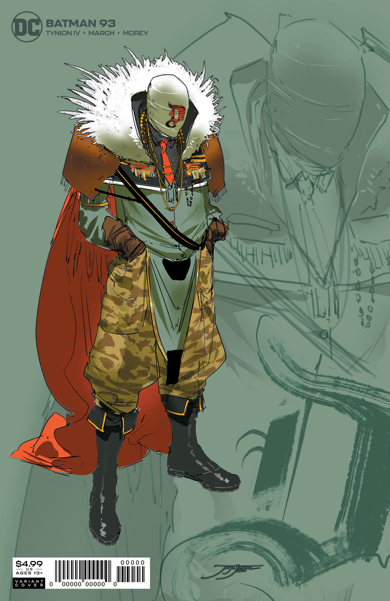 Batman #93, on-sale April 15, has a main cover by Tony S. Daniel and an open-order variant cover by Francesco Mattina. DC has also added a Batman #93 variant cover spotlighting Jorge Jimenez’s art of the Designer, the central antagonist of “Their Dark Designs.”