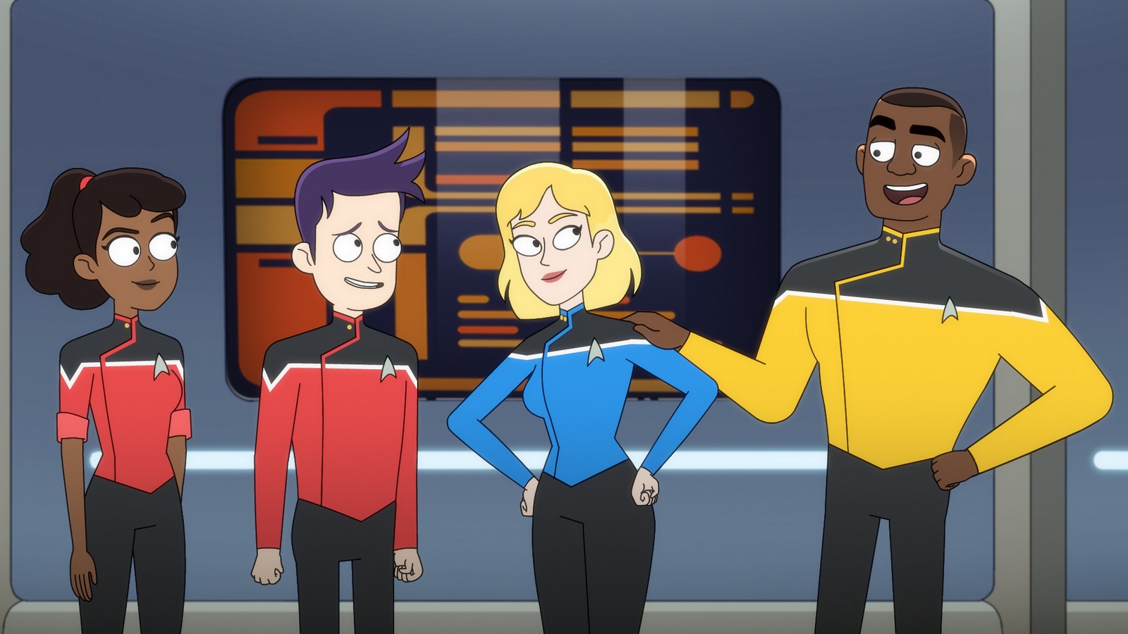 Star Trek: Lower Decks stars No’l Wells as Ensign Tendi; Eugene Cordero as Ensign Rutherford; Tawny Newsome as Ensign Mariner and Jack Quaid as Ensign Boimler.