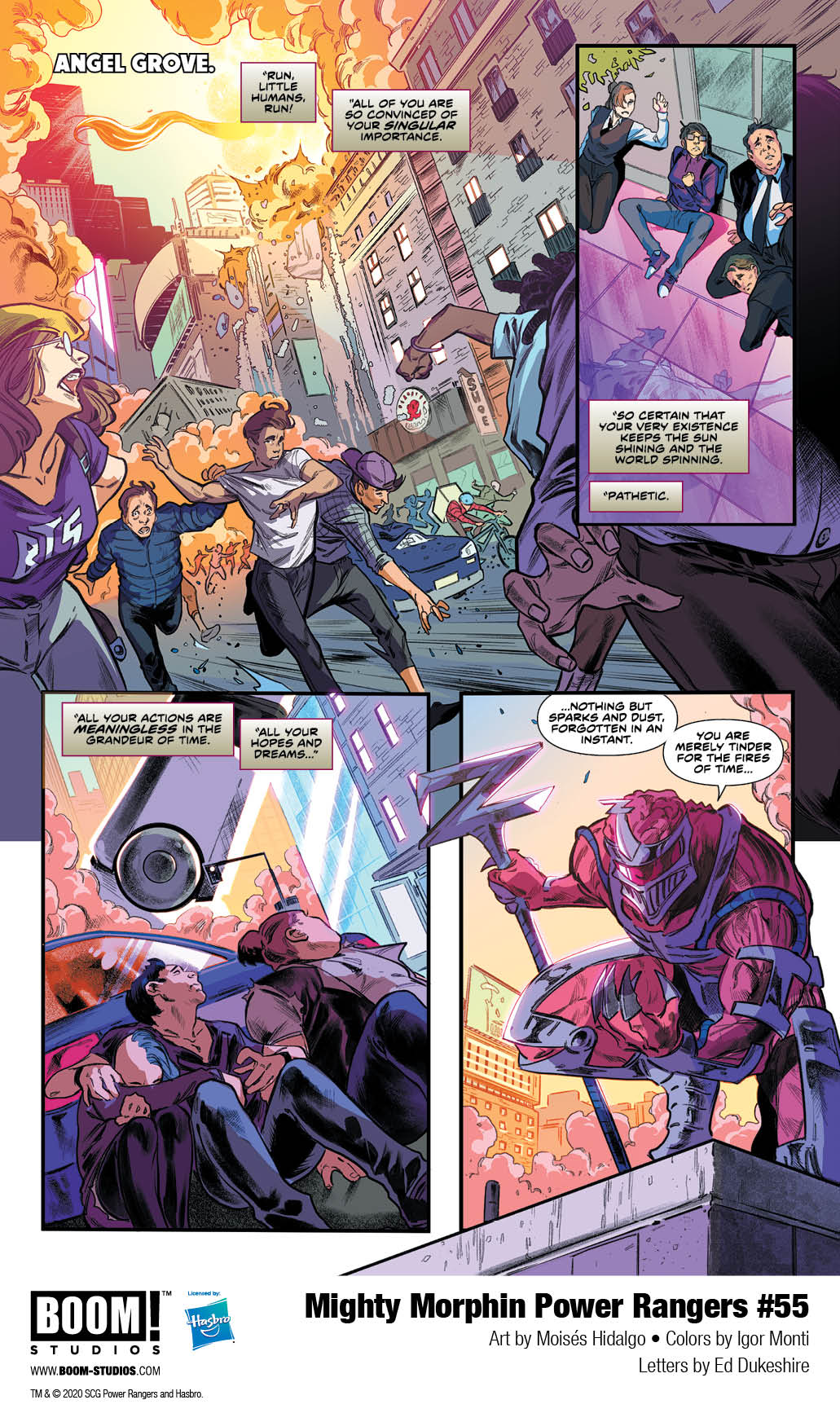 BOOM! Studios, under license by Hasbro, Inc. (NASDAQ: HAS), has revealed a first look at the explosive series finale Mighty Morphin Power Rangers #55, from writer Ryan Parrott (Mighty Morphin Power Rangers/Teenage Mutant Ninja Turtles), artist Moisés Hidalgo (Buffy the Vampire Slayer), colorist Igor Monti with assistance by Sabrina Del Grosso, and letterer Ed Dukeshire, featuring the first appearance of the brand new Green Ranger, available on October 21, 2020.