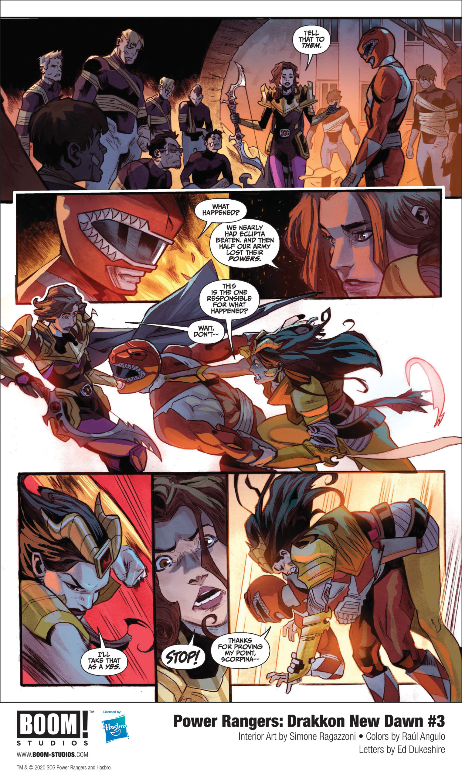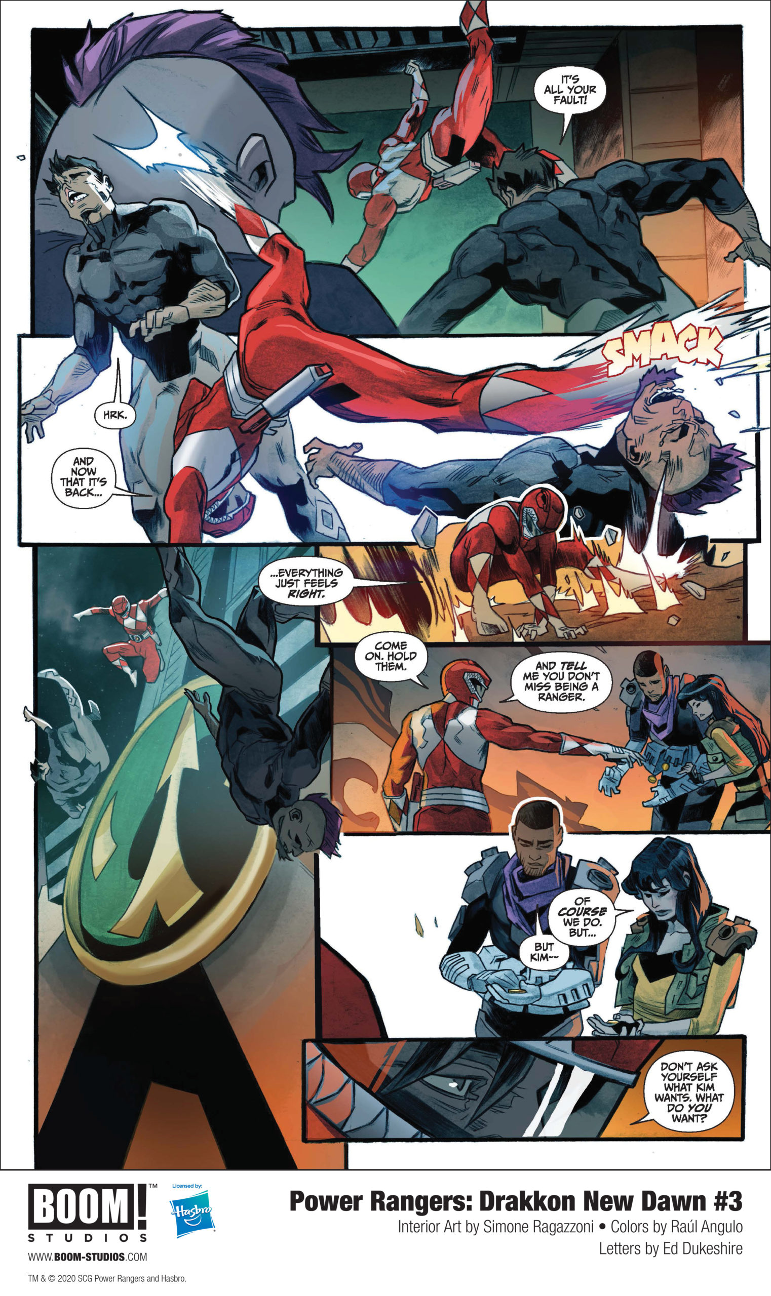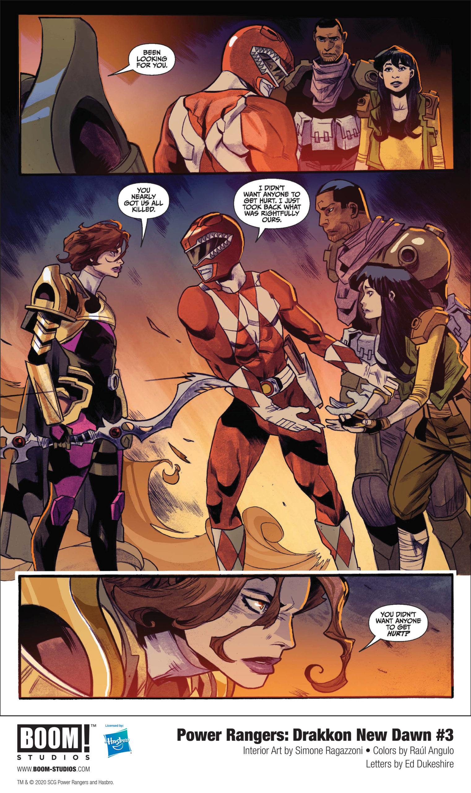 BOOM! Studios, under license by Hasbro, Inc. (NASDAQ: HAS), today revealed a first look at Power Rangers: Drakkon New Dawn #3, the final issue of a three-issue limited series, from writer Anthony Burch (Big Trouble in Little China: Old Man Jack), artist Simone Ragazzoni (Odessa), colorist Raúl Angulo and letterer Ed Dukeshire, featuring the first appearance of The Shattered as the Ranger Slayer—Kimberly Hart, Drakkon’s mightiest warrior—gathers forces from throughout the Coinless Universe to fight against the deadly secrets of her former master’s legacy.