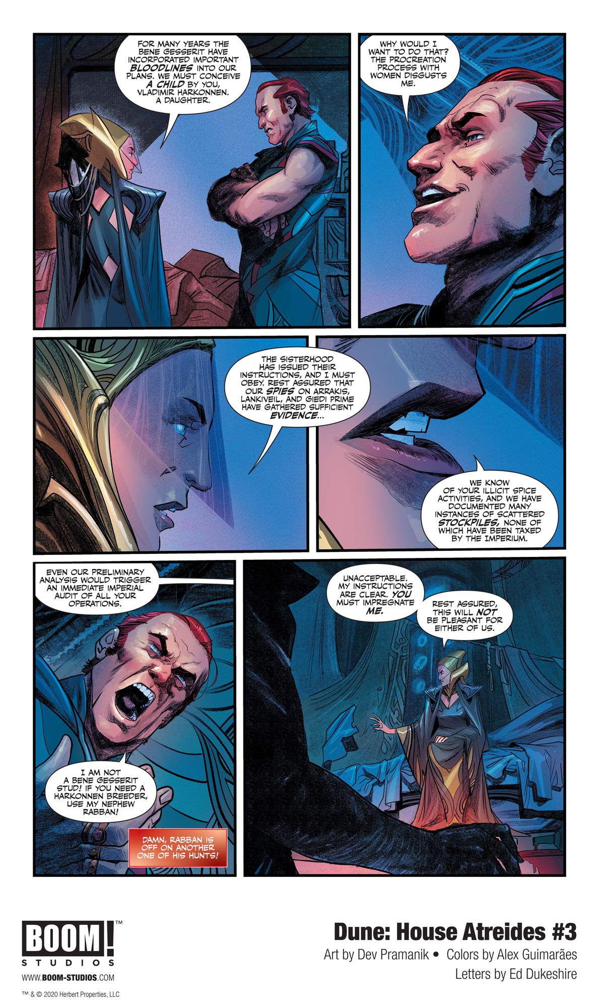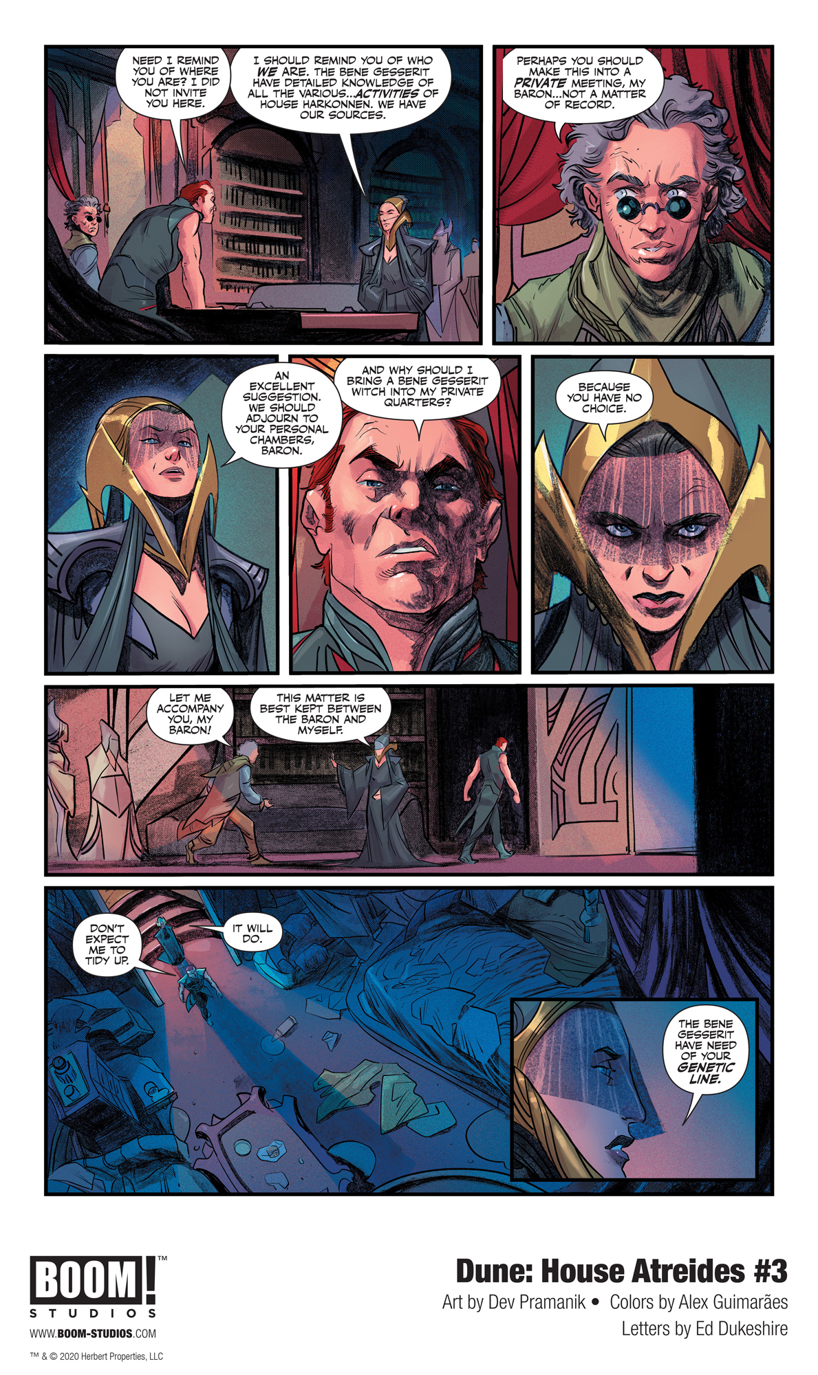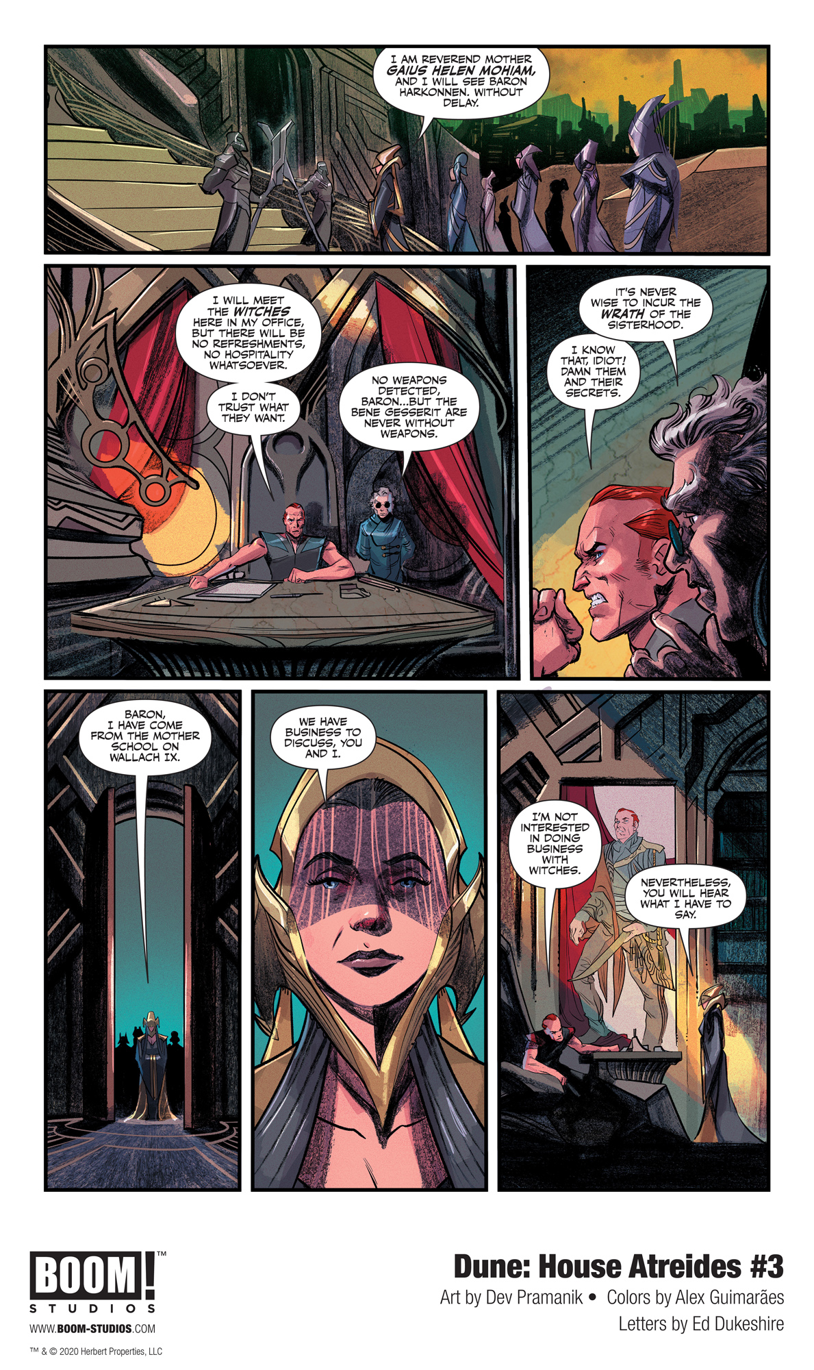 BOOM! Studios today revealed a first look at Dune: House Atreides #3, adapted & scripted by Brian Herbert and Kevin J. Anderson, who co-wrote the eponymous prequel novel based on Frank Herbert’s notes and illustrated by artist Dev Pramanik (Paradiso), colorist Alex Guimarães (Buffy: Every Generation) and letterer Ed Dukeshire (Once & Future), in partnership with Herbert Properties LLC and in full coordination with Abrams ComicArts, who are publishing in the fall the first of three graphic novel adaptations of Herbert’s original classic novel DUNE.
