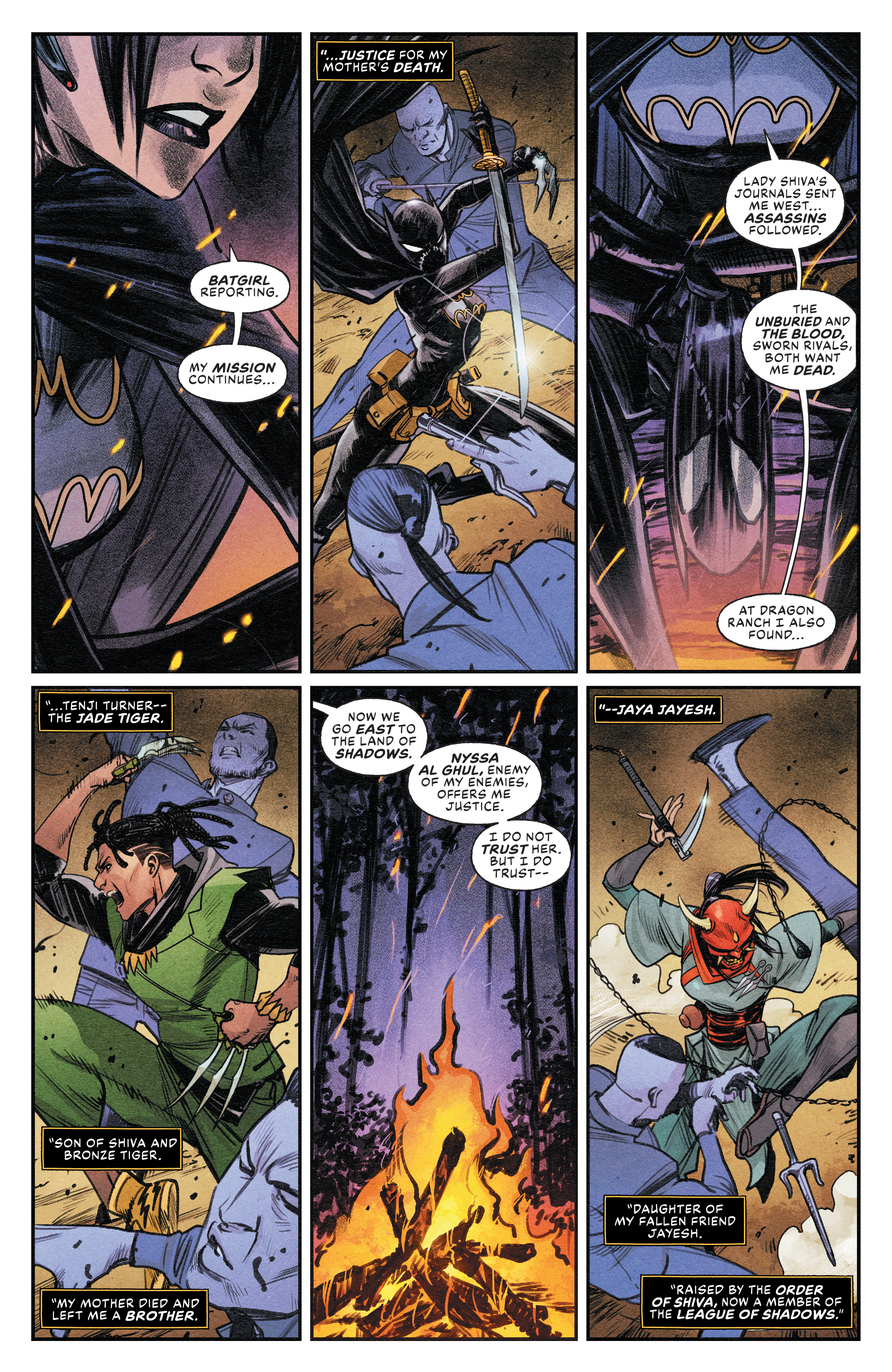 Admittedly even I can’t always remember every plot point exactly when I’m reading several complexly plotted books at the same time. So I’m grateful for the recap bringing me up to speed as Batgirl, Jade Tiger and Jaya reach Samsara. The beautiful hilltop paradise which marks the next stopping point on our journey to defeat the Unburied no… avenge… revenge? Deal with the loss of Cass’ mother aka Lady Shiva. But dealing with that loss and the very meaning behind Cass’ quest are the hottest of topics as year two gets underway.