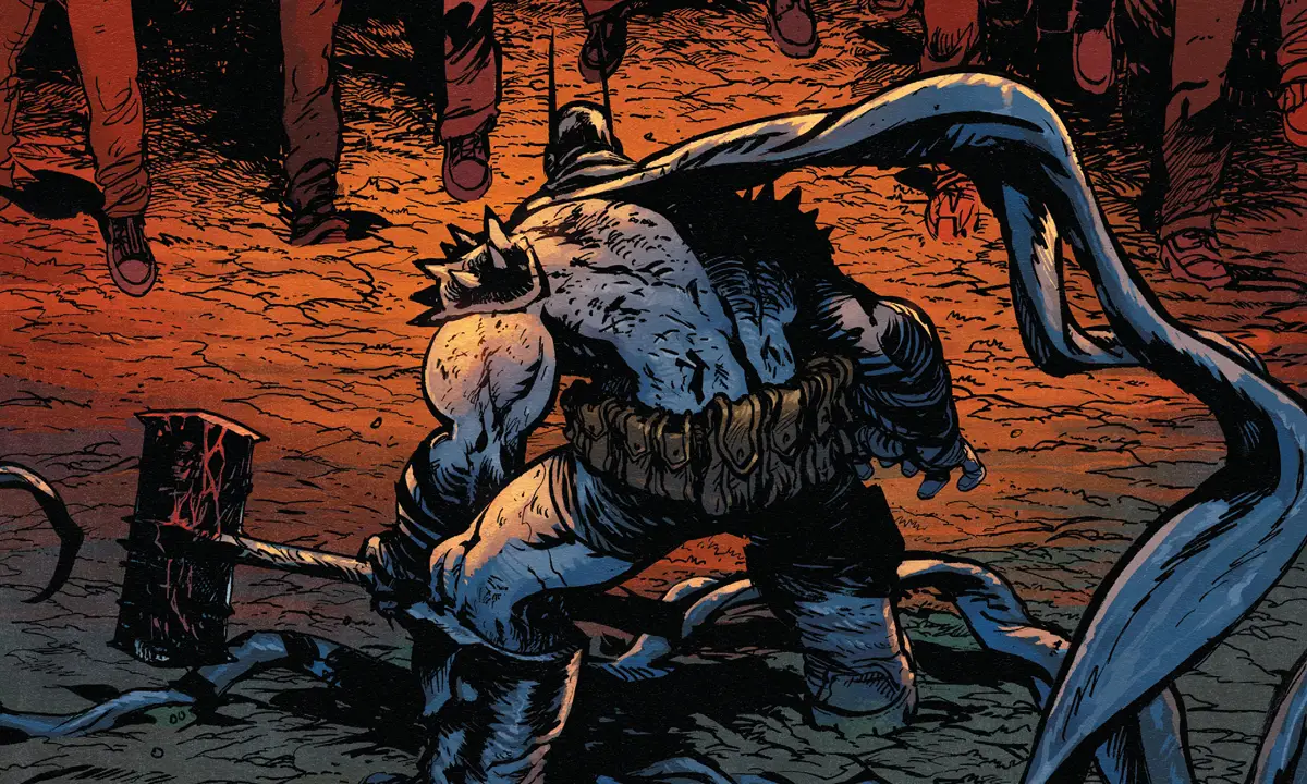Also depicting just how violent the Absolute Universe Batman can be is James Warren. Though his story runs shorter than Johnson’s it still lands with one hell of an impact. It’s a more personal story which follows a group of goons in Black Mask-style masks breaking in to the home of one of their dads. Though the two share a clear bond a falling out has led to this moment. Unfortunately when crime takes place in Gotham the Batman isn’t far behind. The crooks soon find themselves on the sharp end of his brand of violence. It’s less bombastic than Johnson’s take on the character. But Warren’s art finds the most stylish way to bring the story to life.